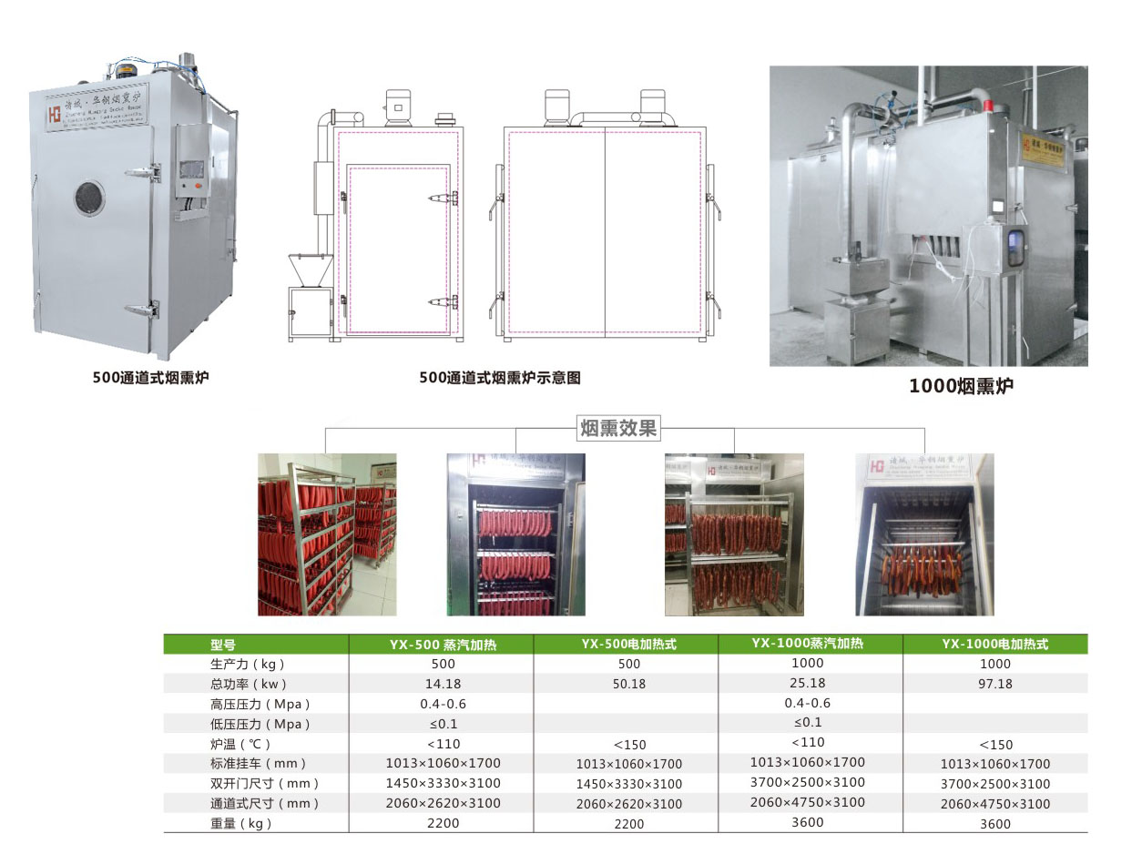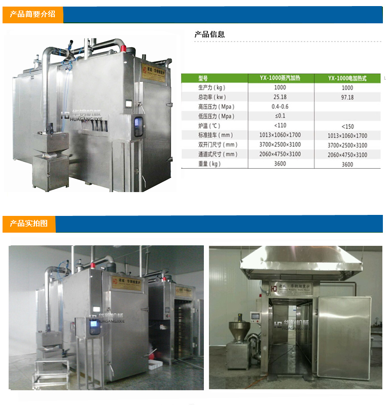 華鋼系列YX-1000煙熏爐適用于用于香腸,火腿,烤腸,培根,臘肉,烤雞,熏魚,烤鴨以及家禽,水產品等熏制產品,烘烤烘干,上色一次成型.煙熏色澤好,口感更佳.質量保證,技術優良,操作方便。經過煙熏后食品的顏色好看,還有一種煙熏后的香味,讓人感覺香而不膩,也能達到環保效果,代替了傳統的煙熏爐方法,節省了工人的勞動了,提高工作效率,更增強了食品的口感及彈性。