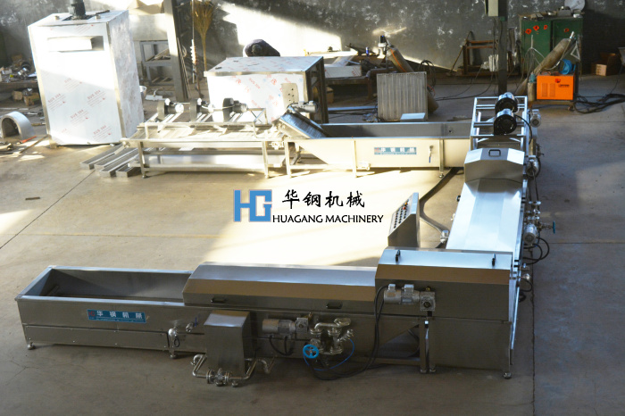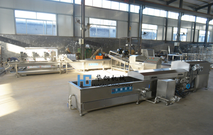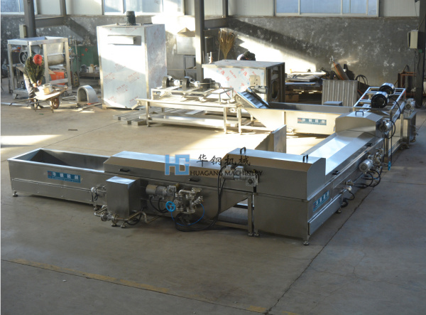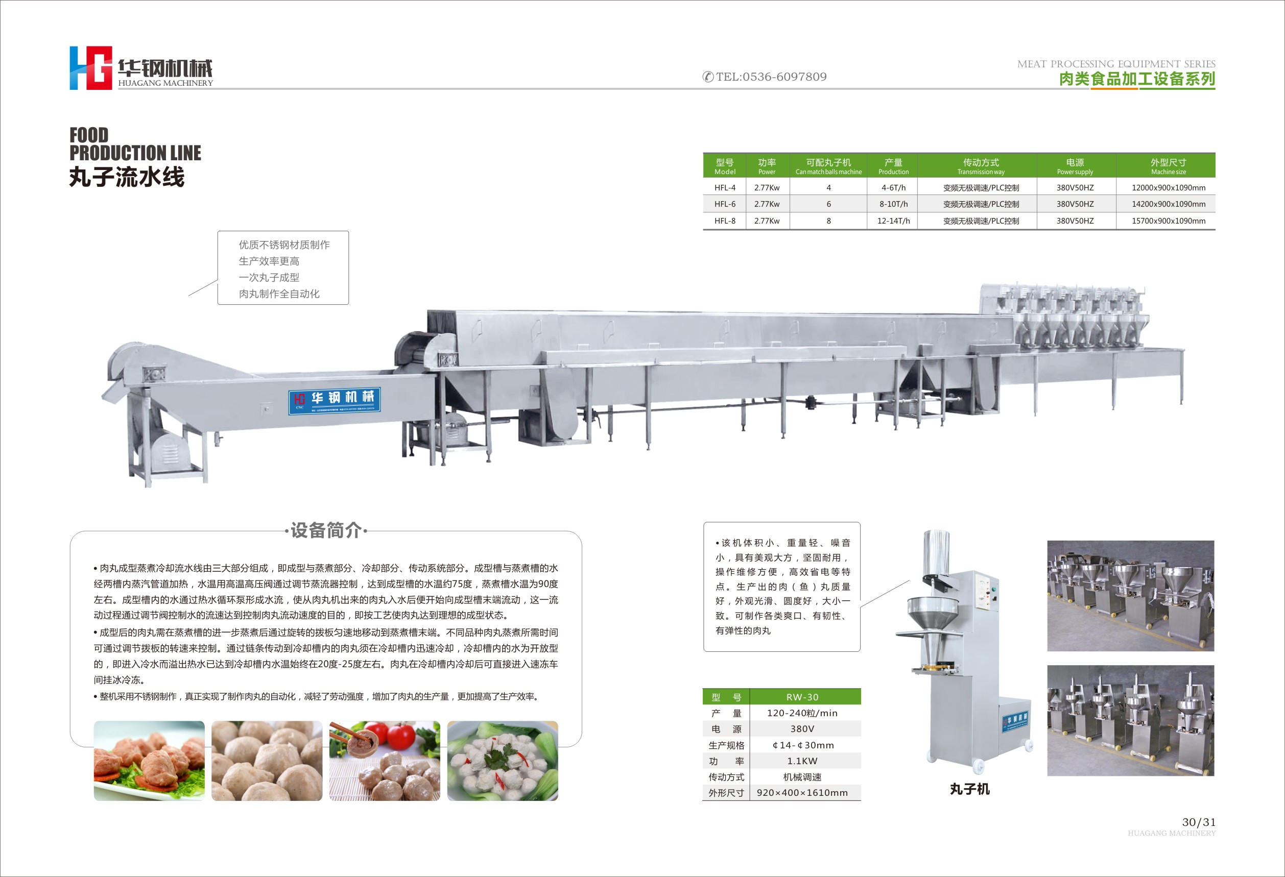 成型后的肉丸需在蒸煮槽的進一步蒸煮后通過旋轉的撥板勻速地移動到蒸煮槽末端。不同品種肉丸蒸煮所需時間可通過調節撥板的轉速來控制,使肉丸達到熟透狀態。蒸煮槽內的丸子由鏈條傳動到冷卻槽內,肉丸須在冷卻槽內迅速冷卻,冷卻槽內的水為開放型的,即進入冷水而溢出熱水已達到冷卻槽內水溫始終在20度-25度左右。肉丸在冷卻槽內冷卻后可直接裝盤進入速凍車間掛冰,或和速凍隧道(單凍機)連接。