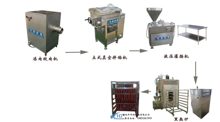 做香腸的話,主要設備有絞肉機+拌餡機+灌腸機+熏蒸爐設備。