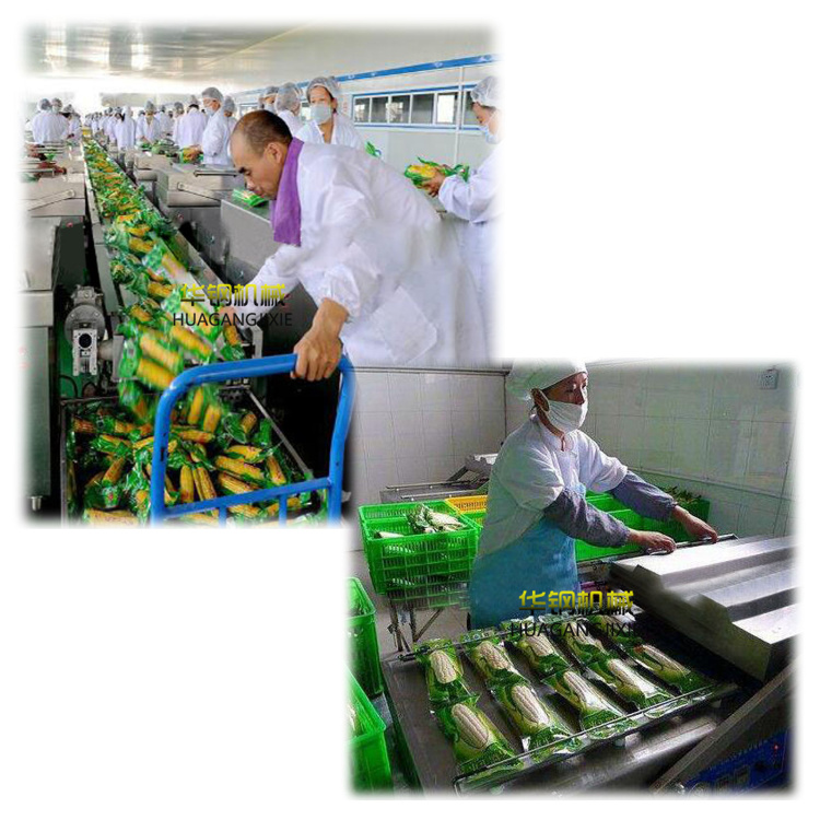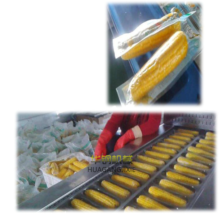 漂燙后的果穗必須及時冷卻,否則由于溫度過高會使玉米粒失水而出現皺褶,影響外觀形象、品質。一般用清水噴淋或在涼水中浸泡3-5分鐘的方法,使果穗表面溫度下降,以保證裝袋時果穗的溫度在50℃左右。相反,溫度過高,在真空裝袋時水分氣化,產生蒸汽,對封口質量產生不良影響。降溫后裝袋,冷卻后的果穗,改作他用。裝袋時要迅速,并使果穗大頭向下,推到包裝袋的底部;不能將玉米漿等雜物殘留在封口處,以免影響封口質量。