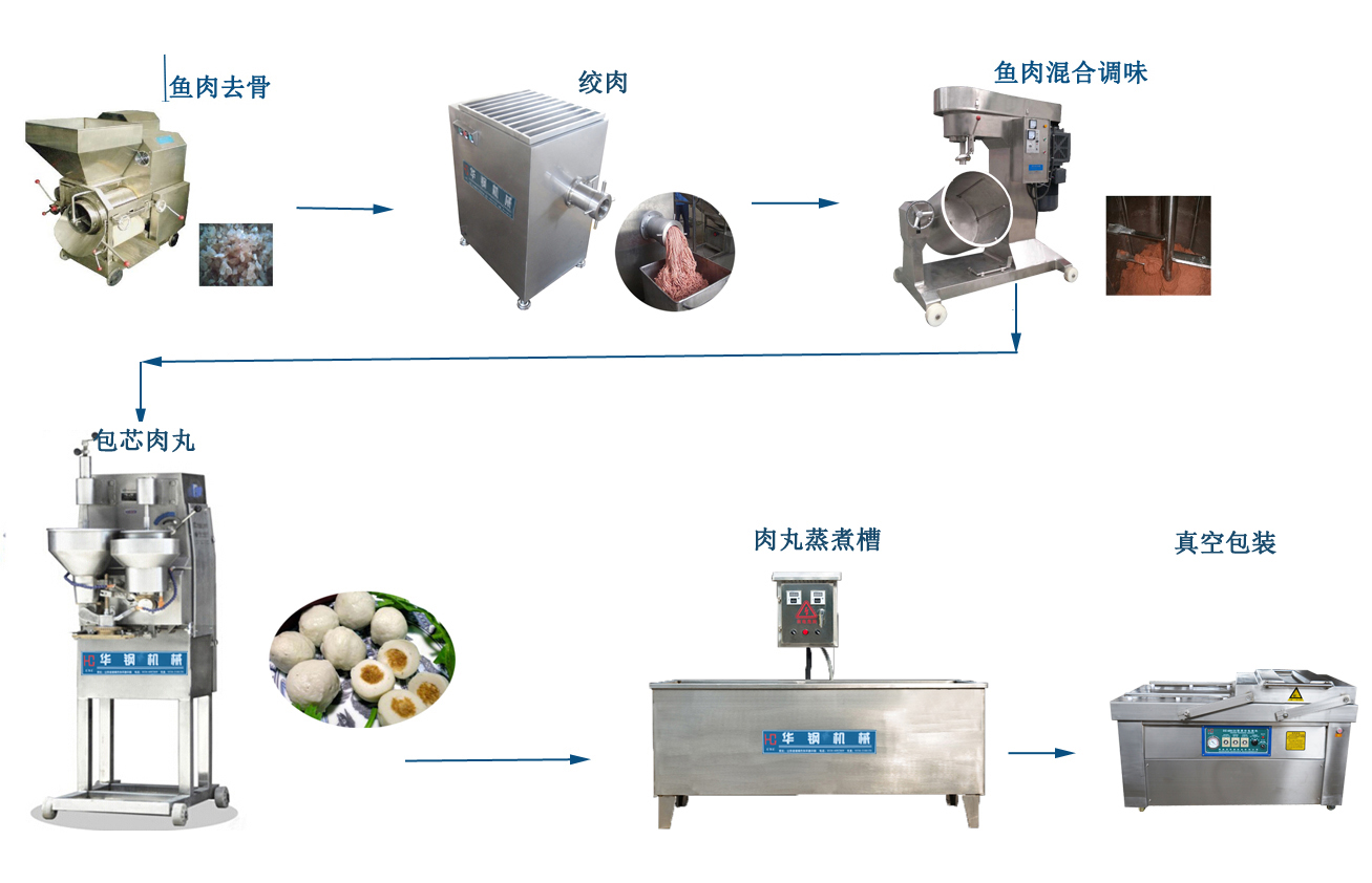 去除魚骨(魚肉采肉機)→肉泥絞肉(絞肉機→與調味料混合打漿(打漿機)→肉丸成型→煮沸→冷卻→包裝(冷凍產品)