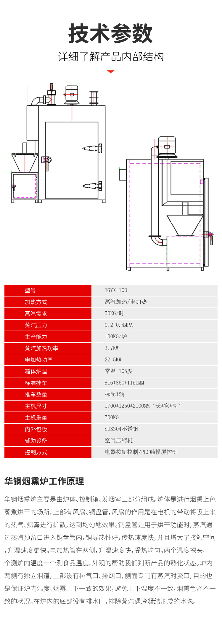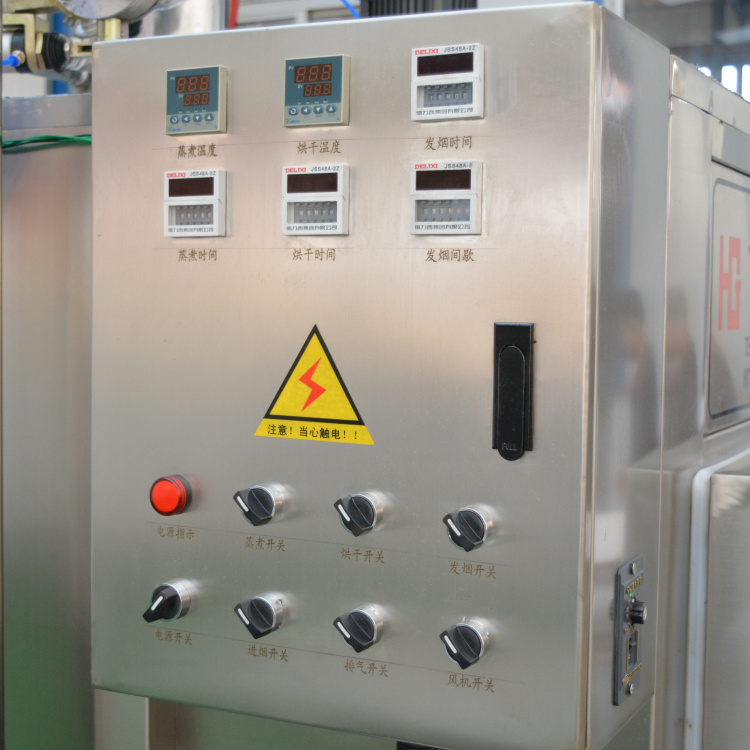 華鋼系列煙熏爐干燥、蒸煮、煙熏三工序可按設(shè)定時間自動轉(zhuǎn)換,溫度按設(shè)定值自動調(diào)節(jié),工序結(jié)束自動顯示;主循環(huán)風(fēng)扇送風(fēng)均勻,使?fàn)t體內(nèi)溫度均勻,該機(jī)特別采用了雙層不銹鋼散熱器,對爐溫升溫迅速,干燥效果好,而目前國內(nèi)煙熏爐同關(guān)產(chǎn)品采用盤管式加熱器,兩者的升溫效果是無法比擬的。采用設(shè)定參數(shù)方式,通用性廣,自動運(yùn)行中的參數(shù)可修正。
