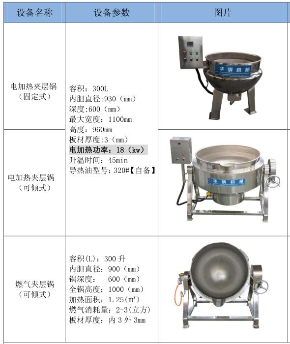 夾層鍋一般分為蒸汽加熱,導熱油電加熱,燃氣加熱等加熱方式。我按照客戶一次加工鹵肉100公斤產量來推薦夾層鍋參數如下: