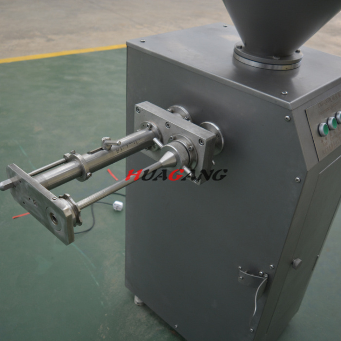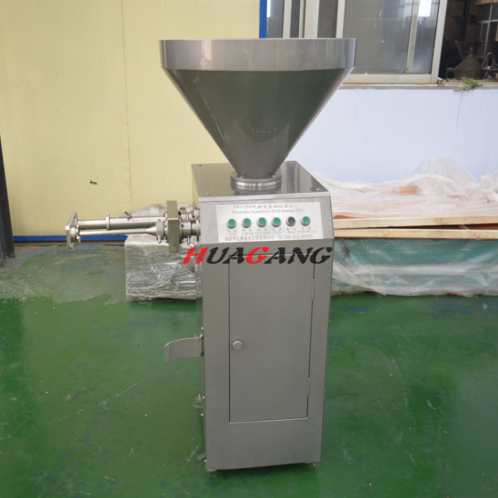 氣動(dòng)定量扭結(jié)灌腸機(jī)外形美觀,小巧玲瓏。與肉食接觸部分及外包裝全部采用不銹鋼制造。易于清洗,定量可在20-500克之間任意可調(diào),誤差僅有3克左右。氣動(dòng)定量扭結(jié)灌腸機(jī),采用控制閥開(kāi)關(guān)汽缸來(lái)調(diào)整加工產(chǎn)品所屬重量,通過(guò)操作面板上按鈕達(dá)到控制各個(gè)程序動(dòng)作的目的。該設(shè)備是在定量灌腸機(jī)的基礎(chǔ)上加以研制的灌腸設(shè)備,該機(jī)既能定量灌腸又能自動(dòng)扭結(jié),改變了過(guò)去定量灌腸扭結(jié)不能一次完成的不足,該機(jī)性能穩(wěn)定,操作安全可靠,在原有的基礎(chǔ)上提高了生產(chǎn)效率