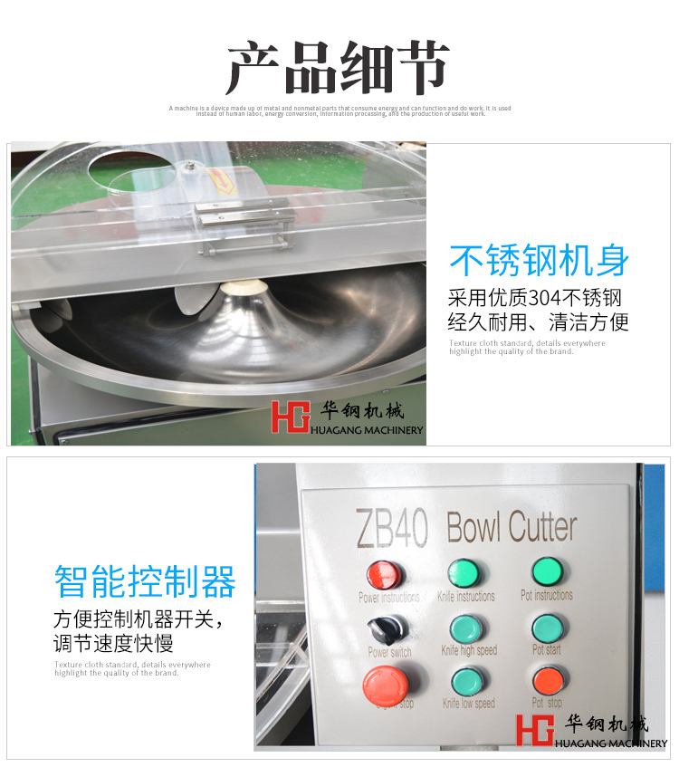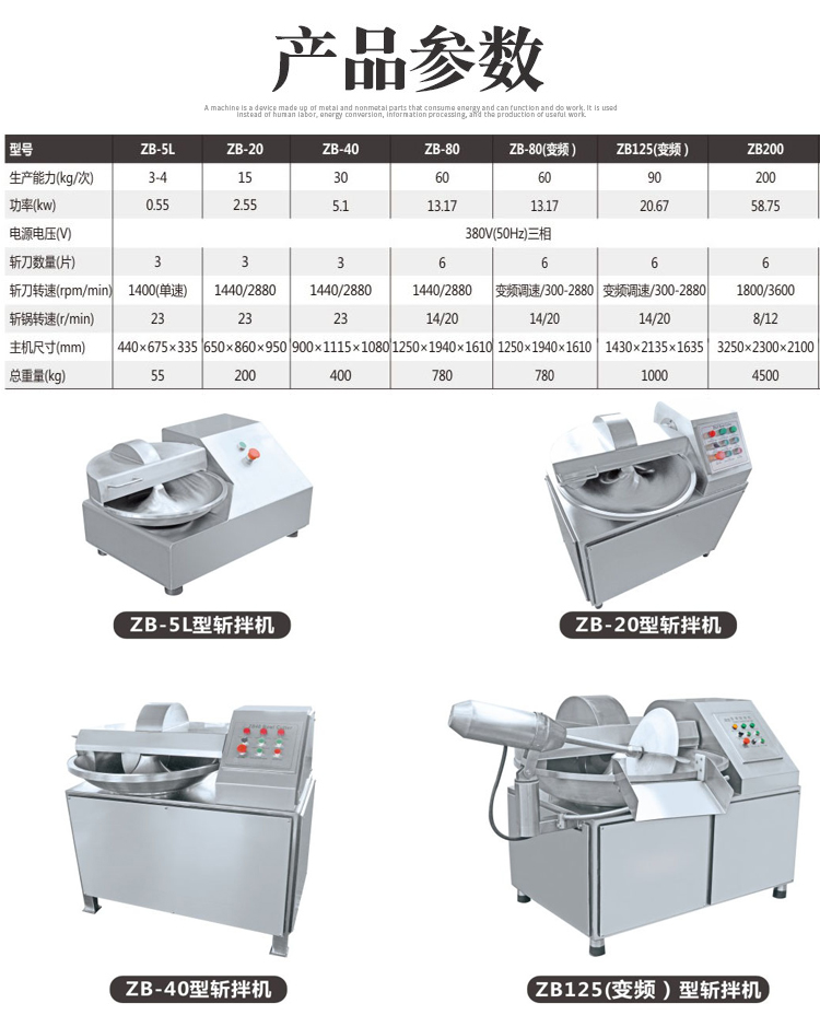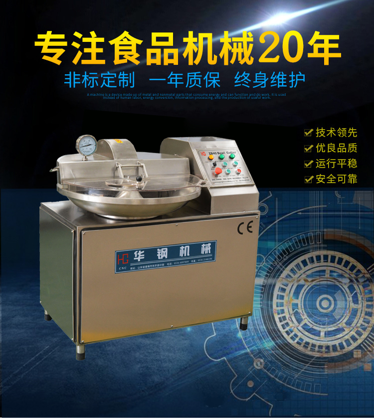 首先,我們先來看斬拌機的材質:斬拌機選用不銹鋼作質料,其構造布局大方漂亮、在操作方面簡單清潔,達我國儀器衛生標準、符合加工廠的操作,斬拌機的高速工作其特色能保證肉制品的斬切細度,發熱小,斬切時間短,進步商品的彈性和出品率。斬刀選用進口經特別技術加工而成,斬鍋為鑄造全不銹鋼原料。