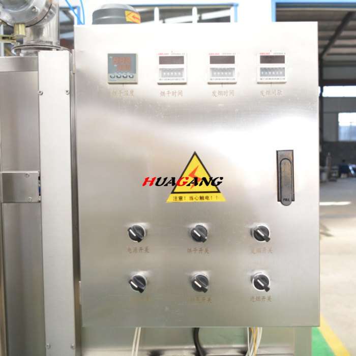 外置發煙:是在煙熏爐一側外部有一個專門的發煙箱,可以滿足客戶在生產中,多次打開發煙箱,來多次投放煙熏木屑,木粉,糖等煙熏料。外置發煙過程與內置發煙相似,只是相比于內置發煙,外置發煙具有發煙大小以及煙霧濃度能自由控制的優勢,并且煙霧通過鼓風機的作用進入煙道后,在通入爐體之前經過過濾作用,使煙熏中的3、4-苯丙比的含量大大減少。