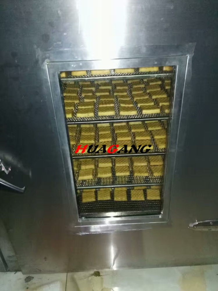 1.首先將壓好裁成塊的豆腐干放在我們提供的煙熏推車托盤上,一般煙熏推車根據(jù)型號(hào)和產(chǎn)量上面可放置6-18層不銹鋼盤子,將每層的盤子/篩子全部擺滿豆腐干。注意:每塊直接要留一公分的間隙。2.將放滿豆腐干的推車推到煙熏爐里面。關(guān)上爐門,通過豆干煙熏爐左側(cè)控制按鈕或者PLC電腦控制面板,設(shè)定溫度和時(shí)間,即可升溫,表皮稍微烘干后打開發(fā)煙開關(guān),煙霧即可在煙熏爐爐體內(nèi)部煙熏豆腐干。煙熏時(shí)間到后自動(dòng)報(bào)警,關(guān)閉發(fā)煙開關(guān),打開排煙開關(guān),將煙霧排到室外后,打開煙熏爐,即可看到煙熏完成的豆腐干。