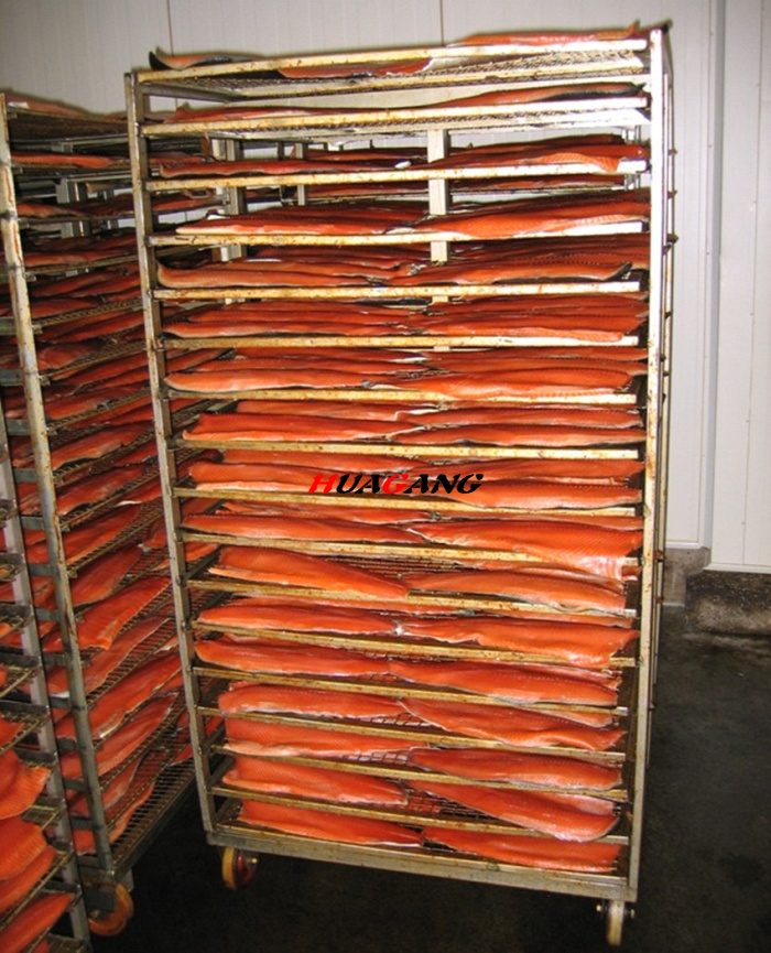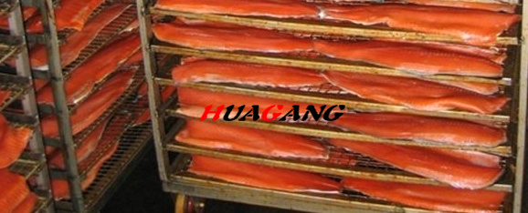 煙熏三文魚主要有冷熏和熱熏兩種熏制工藝,主要以熏制溫度劃分。大多數煙熏三文魚都采用冷熏制法,在傳統熏制過程中,掌握熏爐內的溫度是一門很難掌握的學問和技術。剛開始的加工好的三文魚掛在架子上,下邊圓木條緩慢燃燒鋪上木屑,木屑中的植物油脂化成微小顆粒在魚肉上附著隨著時間的增長慢慢滲透。魚肉、鹽、煙的搭配,營養巧妙的平衡將口感和風味推向了好處。現在煙熏三文魚的制作技術越來越發達,很多現代化的煙熏三文魚生產工廠已經摒棄了傳統的磚窯。取而代之的更為好,溫度更易把控的規模化現代煙熏爐熏制車間。