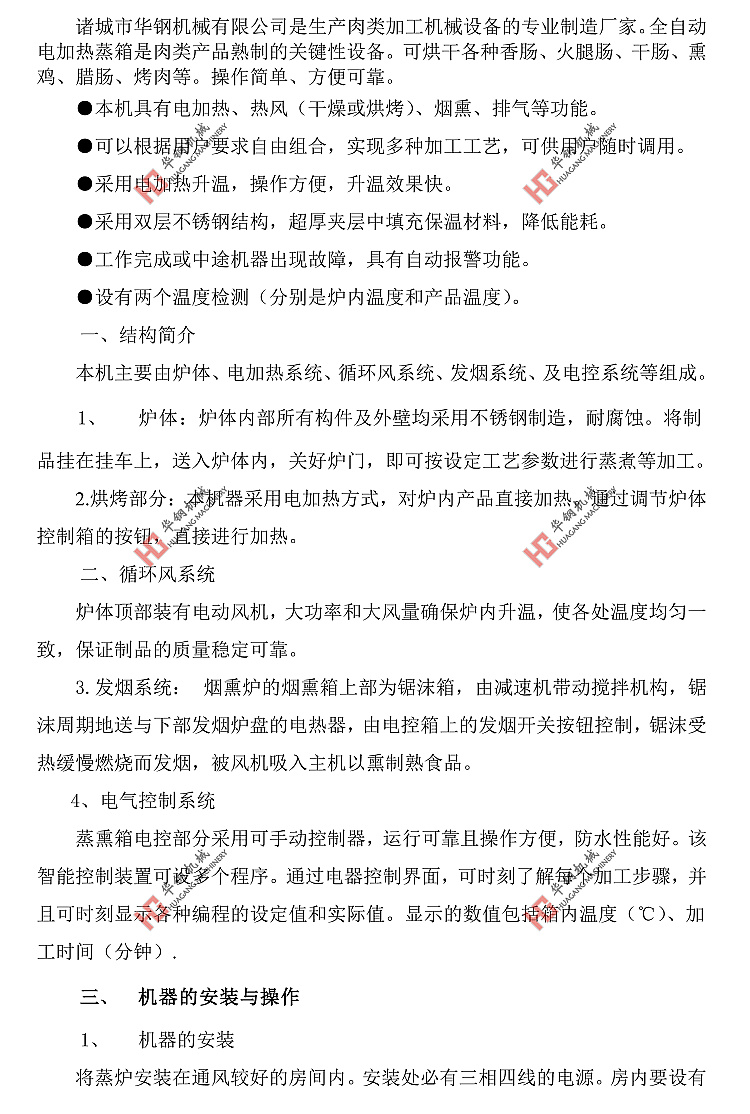 諸城市華鋼機械有限公司是生產肉類加工機械設備的制造廠家。全自動電加熱煙熏機說明書是肉類產品熟制的關鍵性設備。可烘干各種香腸、火腿腸、干腸、熏雞、臘腸、烤肉等。操作簡單、方便可靠。
