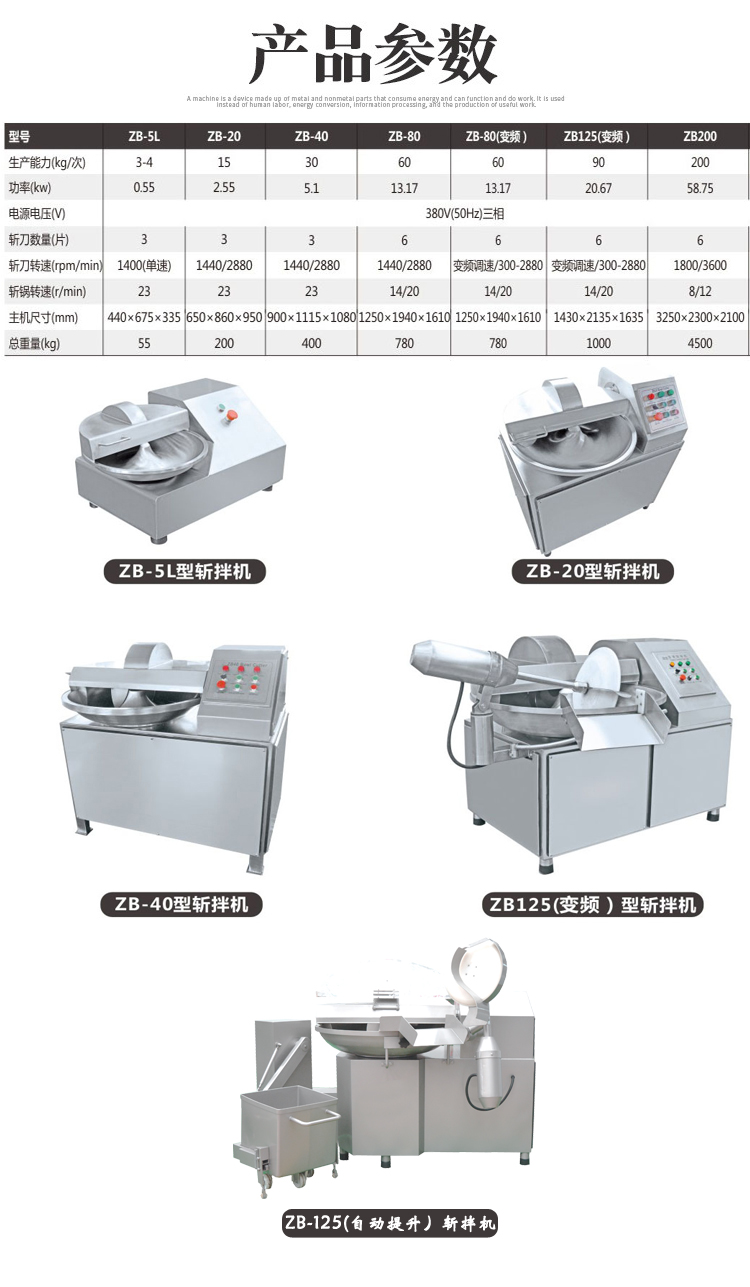 斬拌機是利用斬刀高速旋轉的斬切作用,將肉斬成肉餡或肉泥狀,還可以將肉、輔料、水一起攪拌成均勻的乳化物。本公司生產的斬拌機的刀速、鍋速、斬刀與轉鍋的間隙達到的組合,使斬切產品細度好、升溫小、斬拌時間短。
