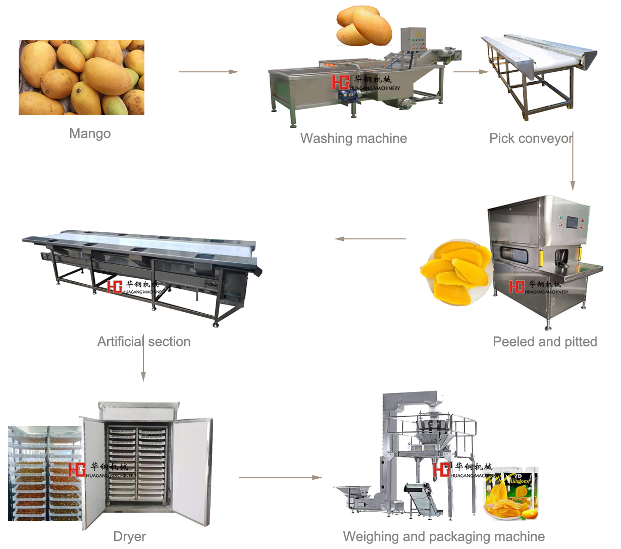 制作芒果干的原料選擇成熟新鮮芒果。首先是肉質肥厚才能提高成品率,成熟度以8-9成為宜,成熟度過低則芒果的色澤和風味較差,過熟則容易腐爛。