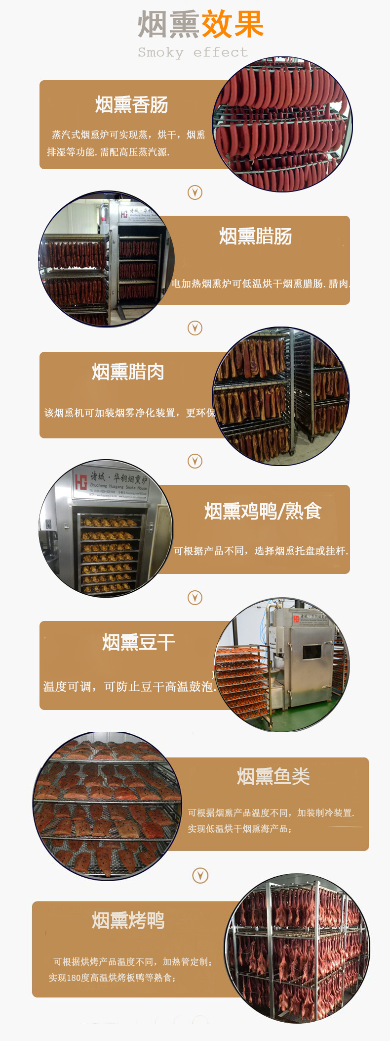 熱熏法溫度為50~85℃,通常在60℃左右,熏制時間4~6小時,是應用較廣泛的一種方法。因為熏制的溫度較高,制品在短時間內就能形成較好的煙熏色澤。熏制的溫度必須緩慢上升,不能升溫過急,否則產生發色不均勻,一般灌腸產品的煙熏采用這種方法。
