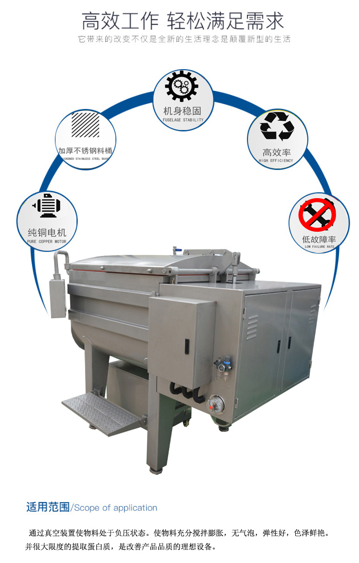 3、真空拌餡機在真空狀態下,餡料攪拌均勻,充分膨脹、彈性好、色澤鮮艷并大大限度地析出蛋白質。