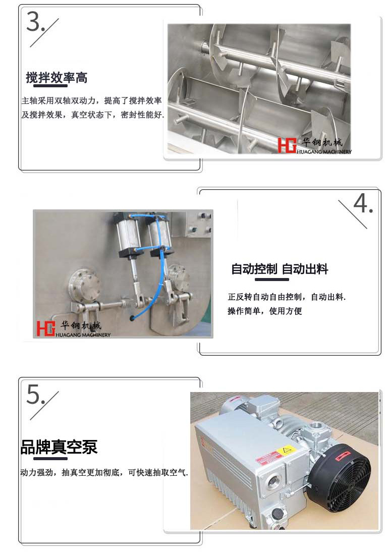 1、真空拌餡機采用平行雙軸結構,斜板式槳葉,物料在料斗中翻動的同時作圓周運動,使各種物料攪拌的更加均勻,沒有死角。