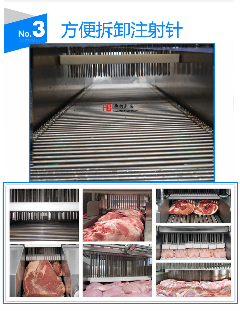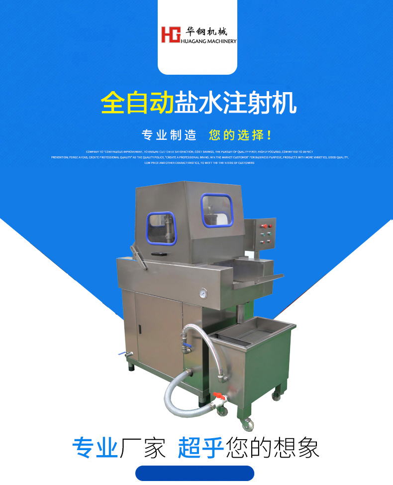 全自動(dòng)鹽水注射機(jī) 鹽水注射機(jī)是利用機(jī)械裝置將腌制劑通過注射針注射入產(chǎn)品,使之在產(chǎn)品內(nèi)均勻分布達(dá)到快速腌制、增加調(diào)味、保持肉食營(yíng)養(yǎng)、強(qiáng)化口感的目的。