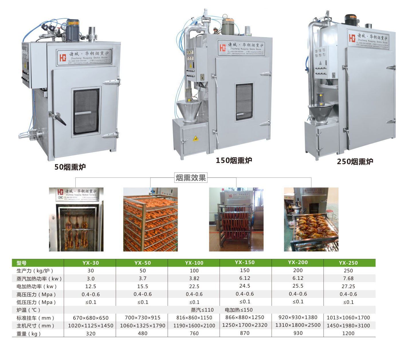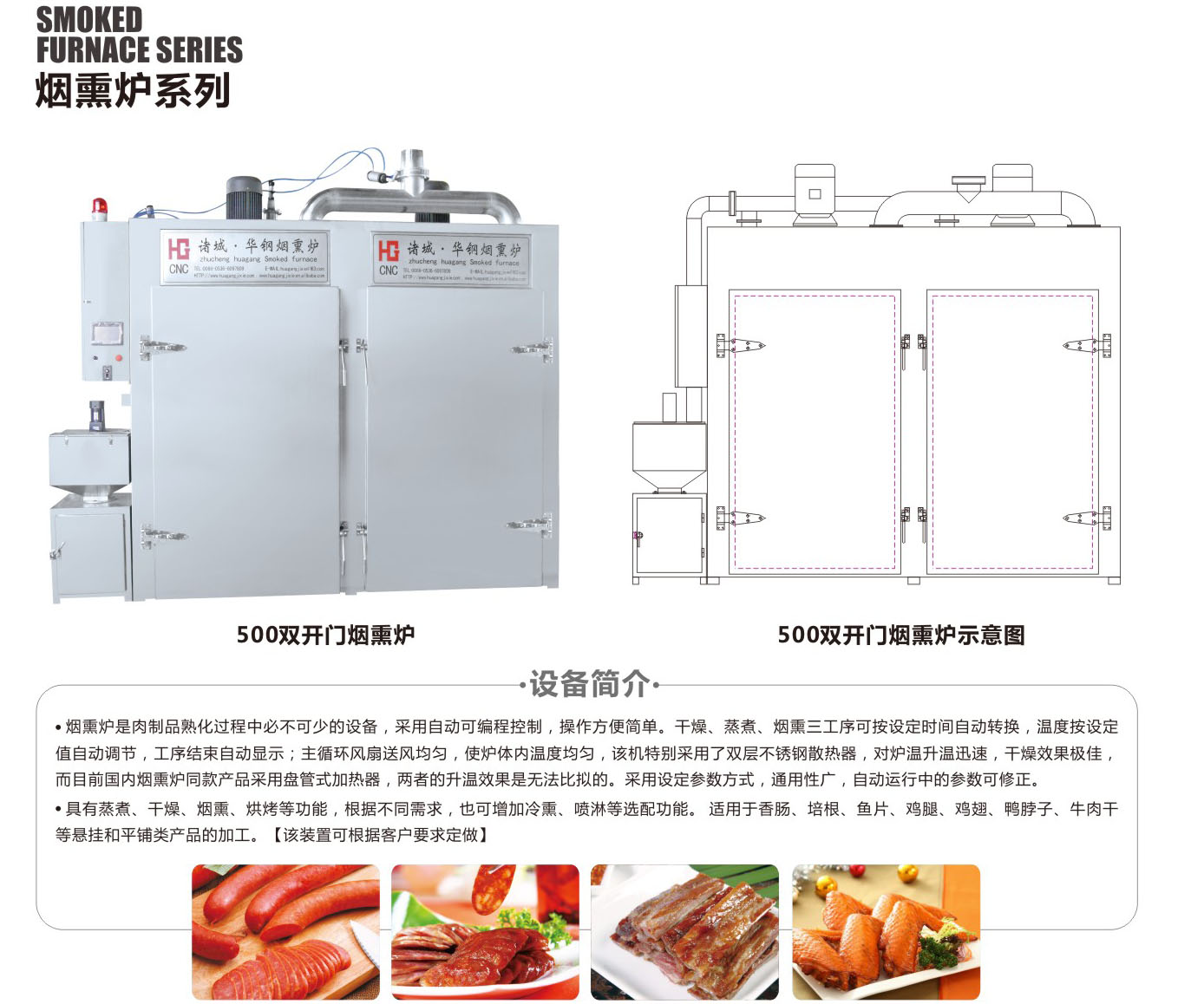 3、循環風系統 :華鋼煙熏爐體頂部裝有雙速電動風機,大功率和大風量確保爐內升溫,使各處溫度均勻一致,保證制品的質量穩定可靠。