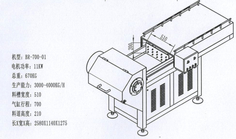 1.加工原料規(guī)格600×400×150/200(mm),每塊2.5~25kg、-4℃~-18℃的凍肉,可直接切成塊狀或片狀,是斬拌機(jī)和絞肉機(jī)的前道工序。