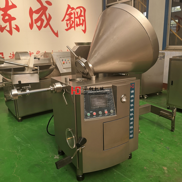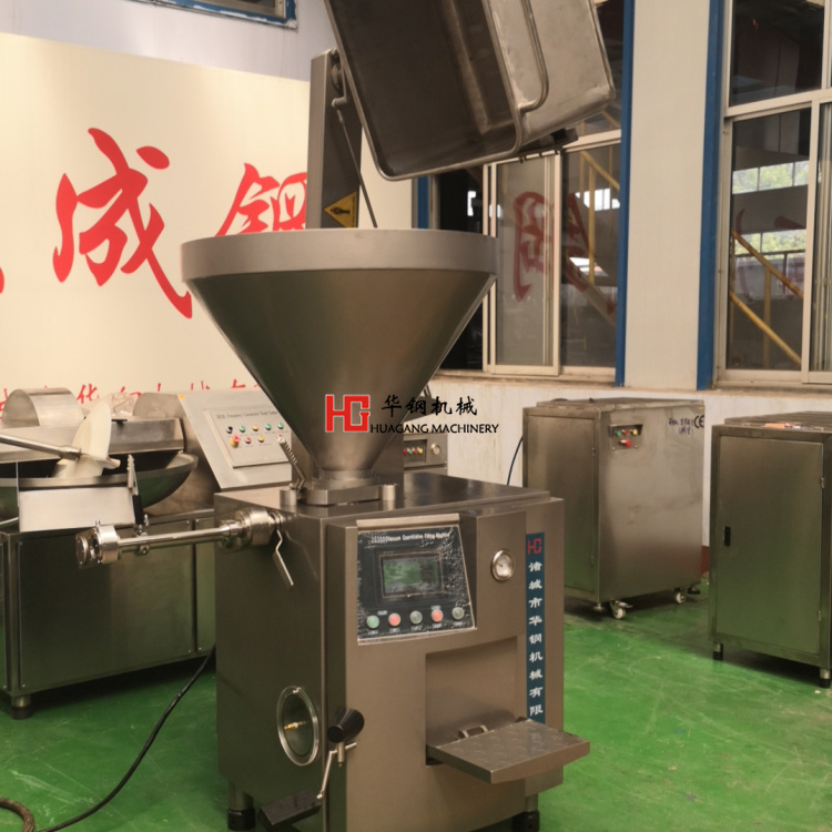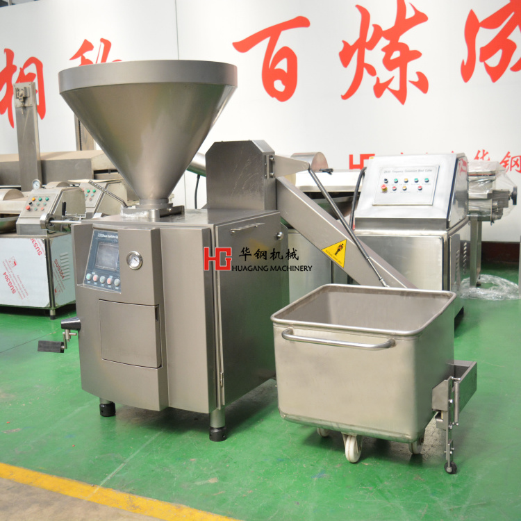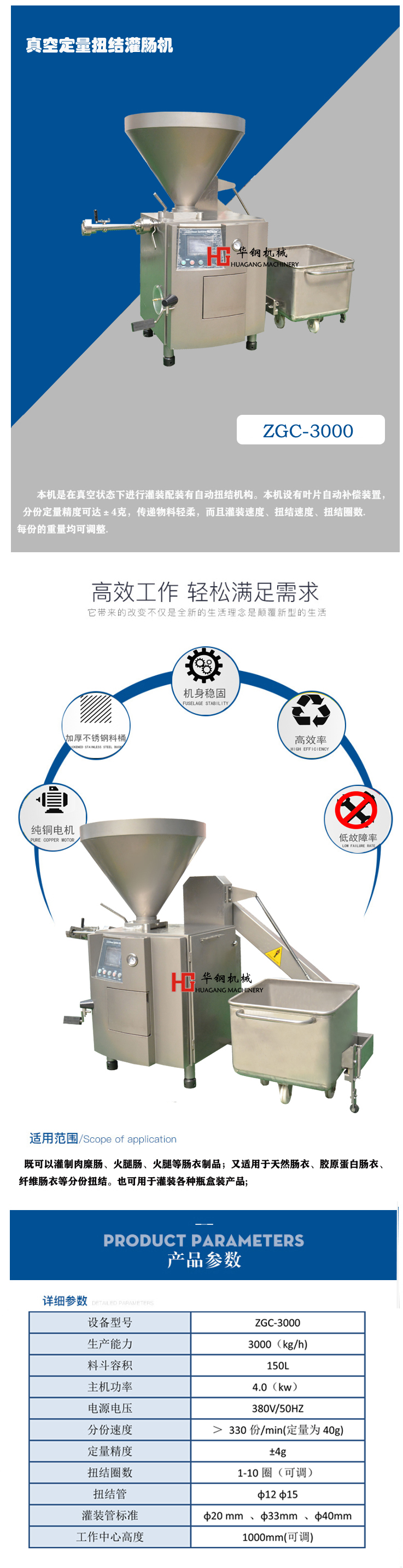 本機是由葉片泵充填、伺服電機驅動、觸摸屏顯示、微機控制的全自動真空定量灌裝機,配裝有自動扭結機構。既可以灌制肉糜腸、火腿腸、火腿等腸衣制品;又適用于天然腸衣、膠原蛋白腸衣、纖維腸衣等分份扭結。也可用于灌裝各種瓶盒裝產品.本機設有葉片自動補償裝置,分份定量精度可達±4克,傳遞物料輕柔,而且灌裝速度、扭結速度、扭結圈數、每份的重量均可調整。本機是在真空狀態下進行灌裝,本機料斗可翻轉,清洗更加方便。本機選用 不銹鋼材料制造,關鍵部件經特殊處理,經久耐磨,控制部分均采用進口元件,外觀經過表面工藝處理,美觀大方,結構緊湊,操作方便,維護保養便捷,設有安全防護裝置,是肉類加工業的理想設備.