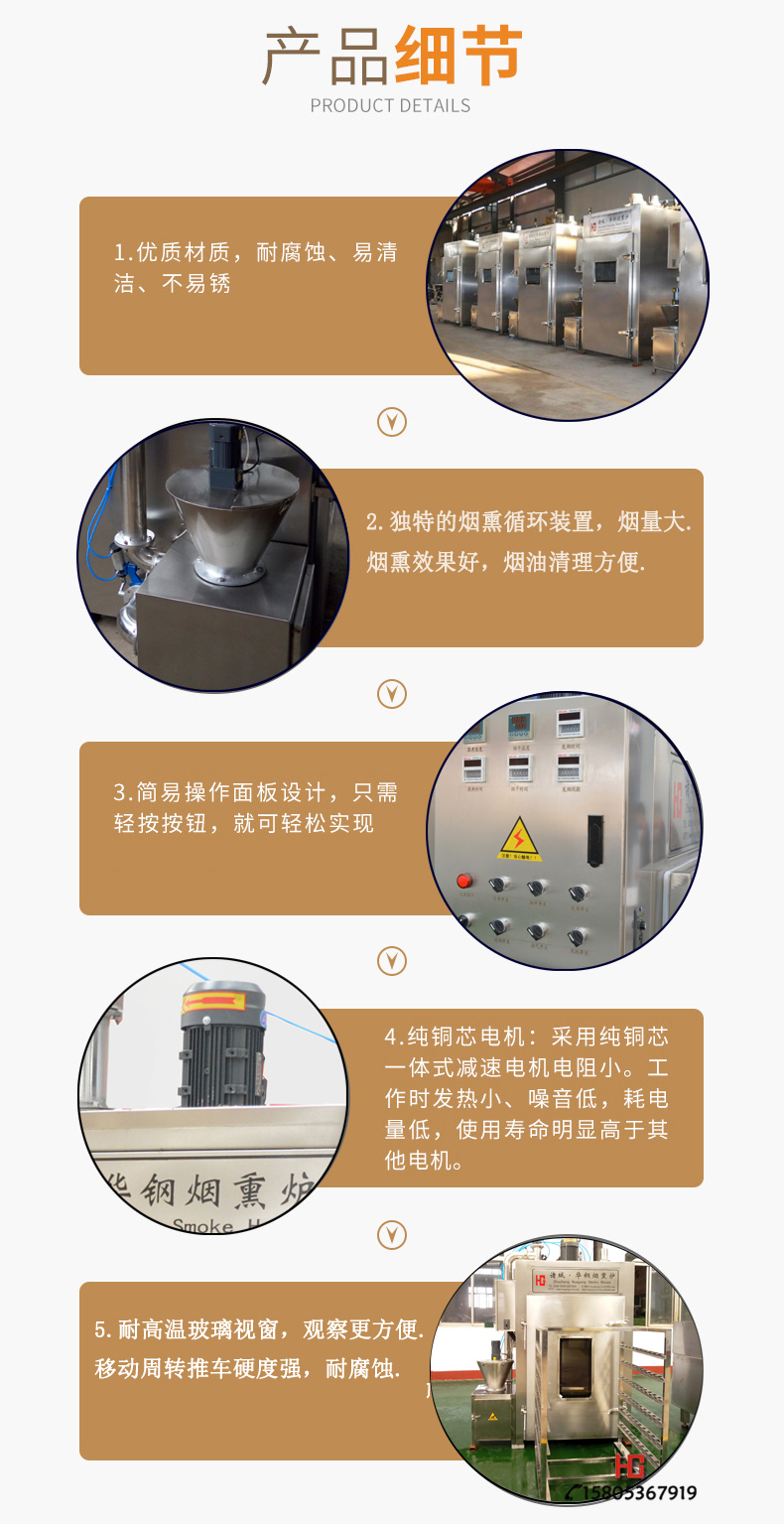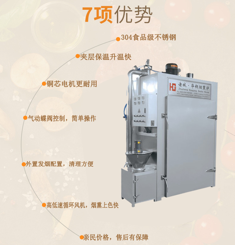 3、循環(huán)風系統(tǒng) :華鋼煙熏爐體頂部裝有雙速電動風機,大功率和大風量確保爐內(nèi)升溫,使各處溫度均勻一致,保證制品的質(zhì)量穩(wěn)定可靠。