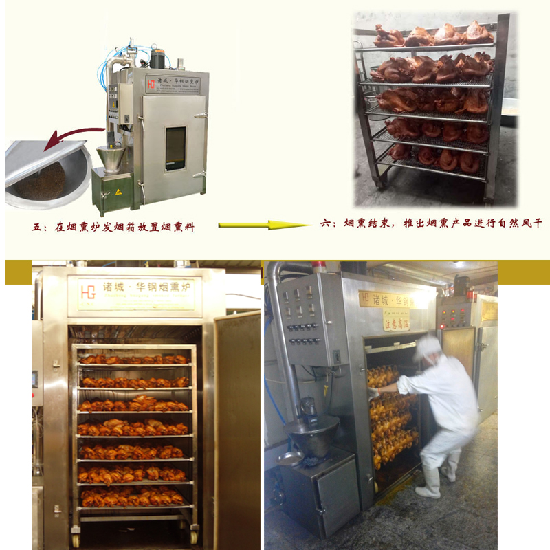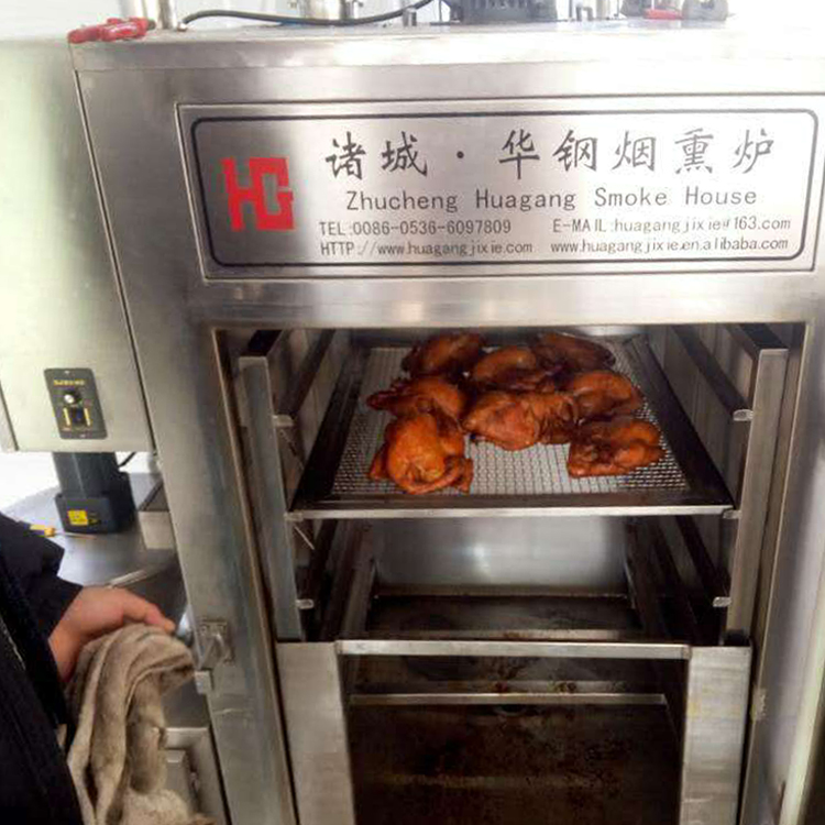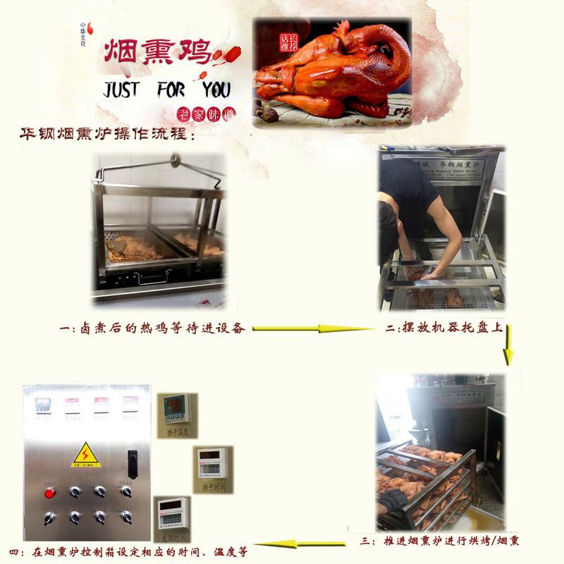 糖熏爐 煙熏爐用于煙熏肉制品熟食,熏雞,熏鴨、熏鴿、烤腸,烤雞,熏魚,烤鴨,煙熏豆腐干臘肉以及家禽,水產品等等熏制產品,烘干,上色一次成型.煙熏色澤好,口感好.質量保證,技術優良,操作方便.經過煙熏后食品的顏色好看,還有一種煙熏后的香味,讓人感覺香而不膩,也能達到環保效果,代替了傳統的煙熏爐方法,節省了工人的勞動力,提高工作效率,更增強了食品的口感及彈性。主循環風扇送風均勻,使爐體內溫度均勻,采用設定參數方式,通用性廣,自動運行中的參數可修正。