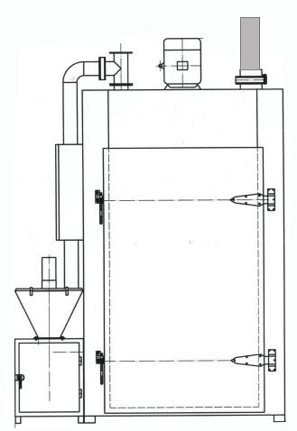 設備由煙熏箱、自動程序控制器、煙霧發生器、煙熏車四部分組成。關鍵部件是由蒸汽管道、熱交換器和出氣通道組成完善的循環系統,箱內熏煙與熱氣的混合氣體在兩組循環風機的作用下,形成渦流區域,使混合氣體以適宜的速度平衡而均勻地通過懸掛在煙熏箱內的肉制品,使其熟化和滅菌。