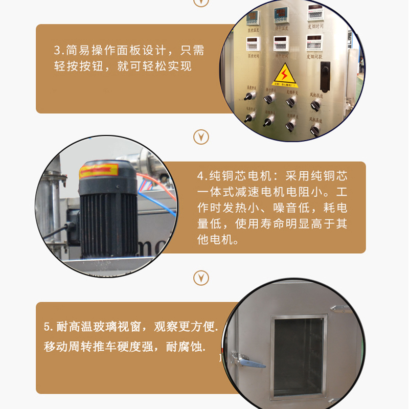 歷經(jīng)十多年的科學研究和生產(chǎn)制造,依據(jù)顧客規(guī)定和銷售市場意見反饋信息內(nèi)容開展了更為有效的改善,使其煙熏實際效果和加溫速率做到了預估的實際效果。