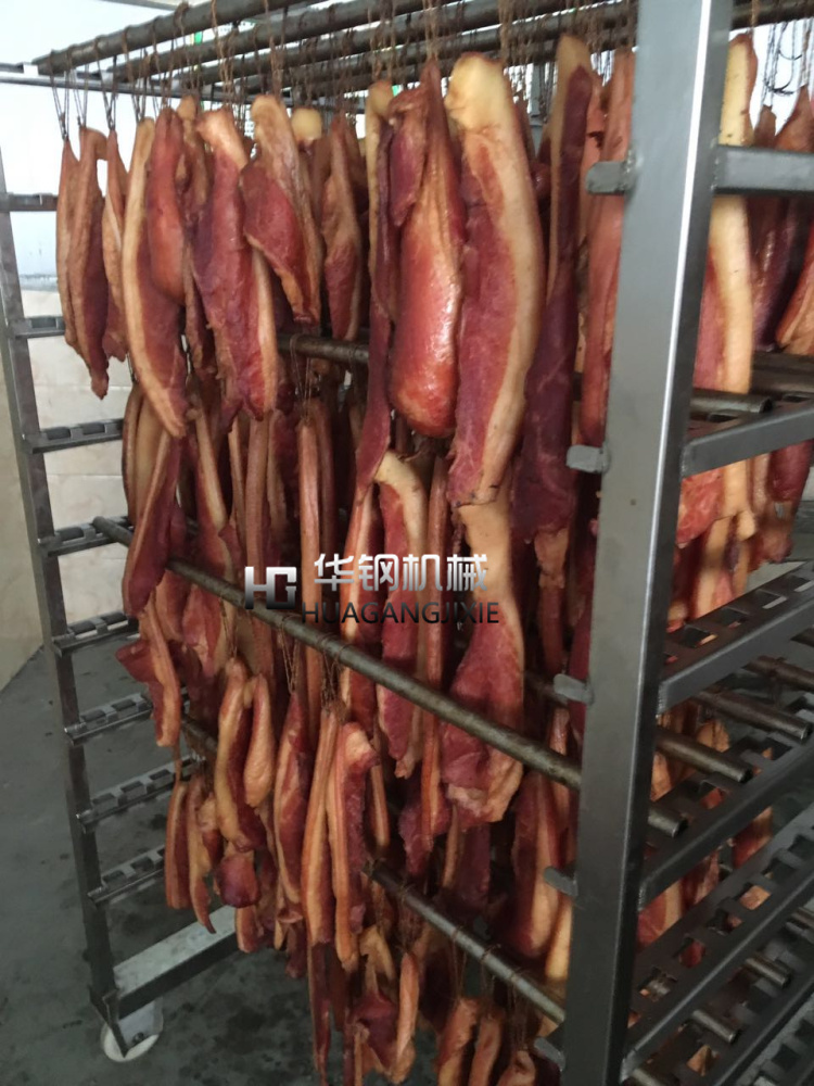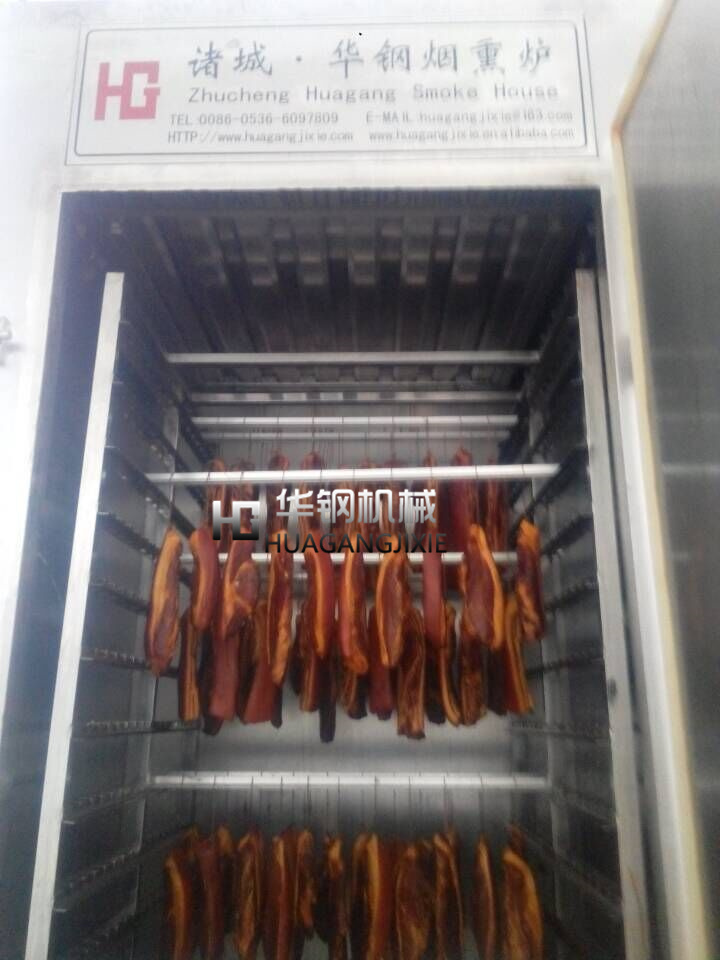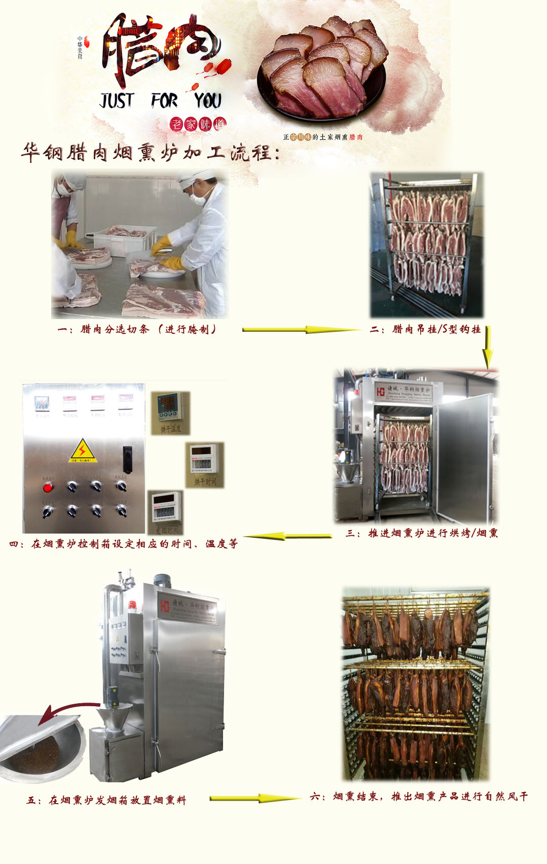 熏臘肉設備 在臘肉生產的過程中,煙熏是十分重要的環節,它對產品的色澤、風味有很大的影響,而傳統的柴火加熱熏肉方法是無法使得臘肉熏制均勻,同時煙灰可能粘連在肉品上,影響臘肉的口感。隨著市場上煙熏爐的出現,進而解決了傳統熏制的弊端。市場上煙熏爐除了具有臘肉熏制的功能,還具有蒸煮、干燥、烘烤、排風、清洗等功能,可謂是一機多用。