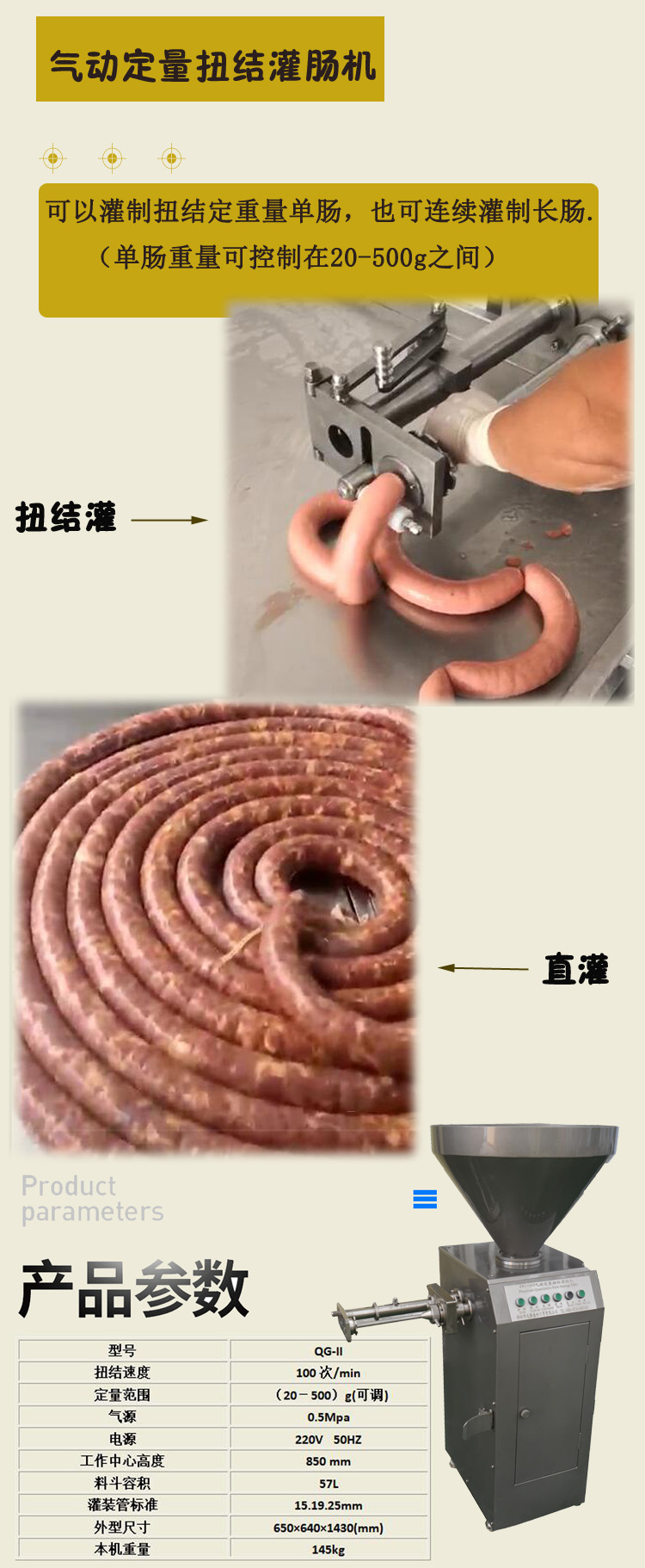 氣動定量扭結灌腸機外形美觀,小巧玲瓏。與肉食接觸部分及外包裝全部采用不銹鋼制造。易于清洗,定量可在20-500克之間任意可調,誤差僅有3克左右。氣動定量扭結灌腸機,采用控制閥開關汽缸來調整加工產品所屬重量,通過操作面板上按鈕達到控制各個程序動作的目的。該設備是在定量灌腸機的基礎上加以研制的灌腸設備,該機既能定量灌腸又能自動扭結,改變了過去定量灌腸扭結不能一次完成的不足,該機性能穩定,操作安全可靠,在原有的基礎上提高了生產效率.