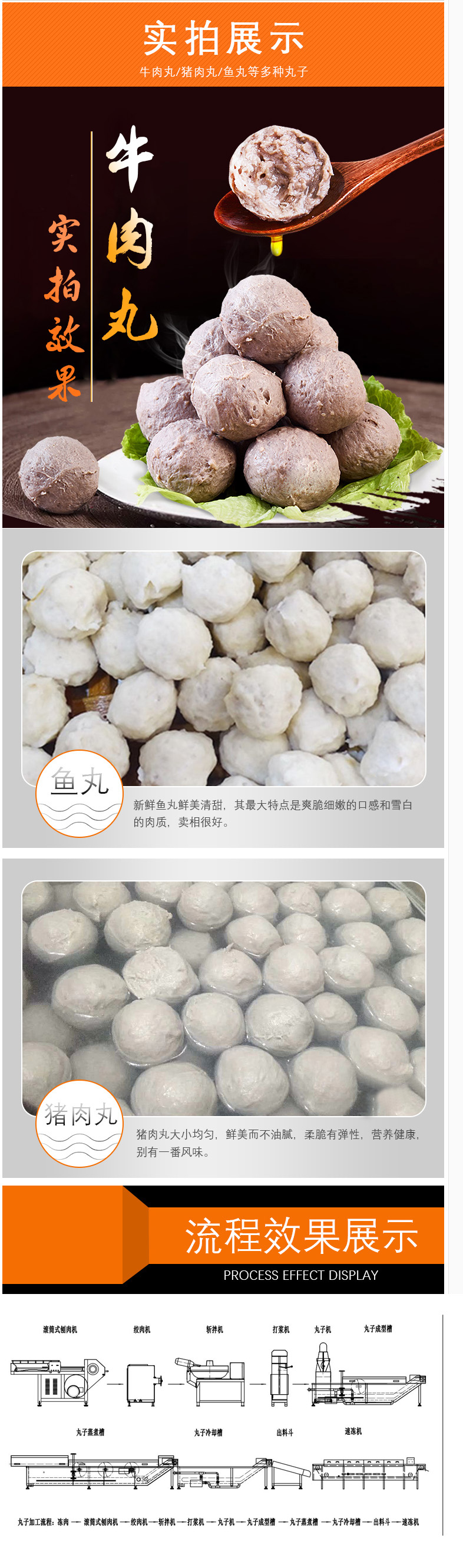 丸子生產線加工工藝流程:凍肉前期處理(解凍)→凍肉刨肉機→凍肉絞肉機→斬拌機→打漿機→肉丸成型蒸煮冷卻生產線→包裝→速凍。