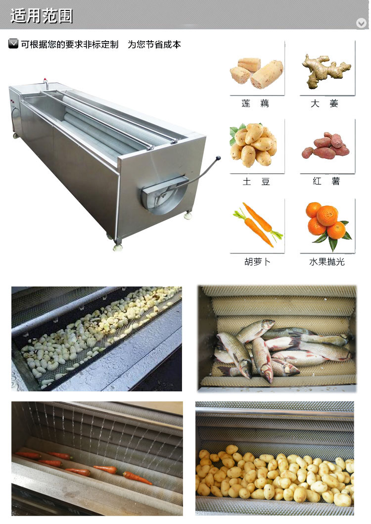 用途:清洗去皮機(jī)是公司專門為胡蘿卜、土豆、地瓜、大姜及獼猴桃等水果蔬菜清洗或去皮而土豆清洗去皮機(jī)設(shè)計(jì)制造的實(shí)用型設(shè)備。當(dāng)物料進(jìn)入臥式旋轉(zhuǎn)的毛刷輥內(nèi),經(jīng)毛刷滾反復(fù)不停在毛刷清洗去皮機(jī)同一旋轉(zhuǎn)方向(由高到低)互相磨擦,大型毛刷土豆去皮機(jī)達(dá)到清洗去皮的目的。整機(jī)不銹鋼制成,能充分適應(yīng)加工中心的潮濕環(huán)境,電動土豆清洗去皮機(jī)機(jī)身,機(jī)架不生銹,增加本機(jī)的使用壽命。