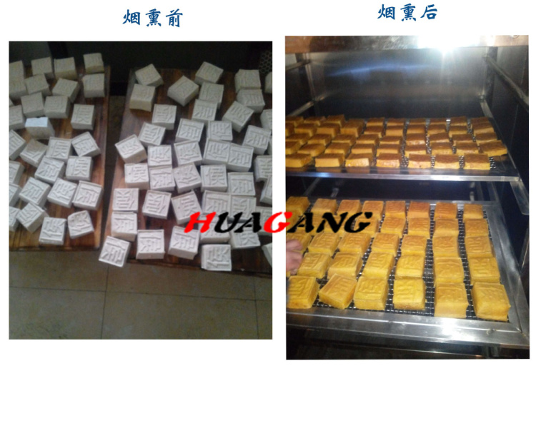 1.首先將壓好裁成塊的豆腐干放在我們提供的煙熏推車托盤上,一般煙熏推車根據型號和產量上面可放置6-18層不銹鋼盤子,將每層的盤子/篩子全部擺滿豆腐干。注意:每塊直接要留一公分的間隙。2.將放滿豆腐干的推車推到煙熏爐里面。關上爐門,通過豆干煙熏爐左側控制按鈕或者PLC電腦控制面板,設定溫度和時間,即可升溫,表皮稍微烘干后打開發煙開關,煙霧即可在煙熏爐爐體內部煙熏豆腐干。煙熏時間到后自動報警,關閉發煙開關,打開排煙開關,將煙霧排到室外后,打開煙熏爐,即可看到煙熏完成的豆腐干。