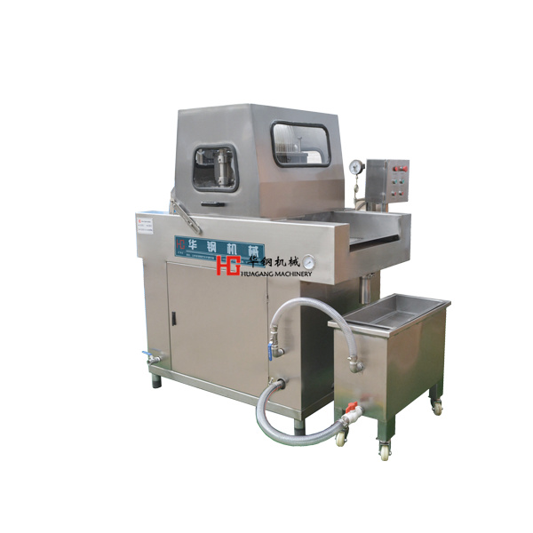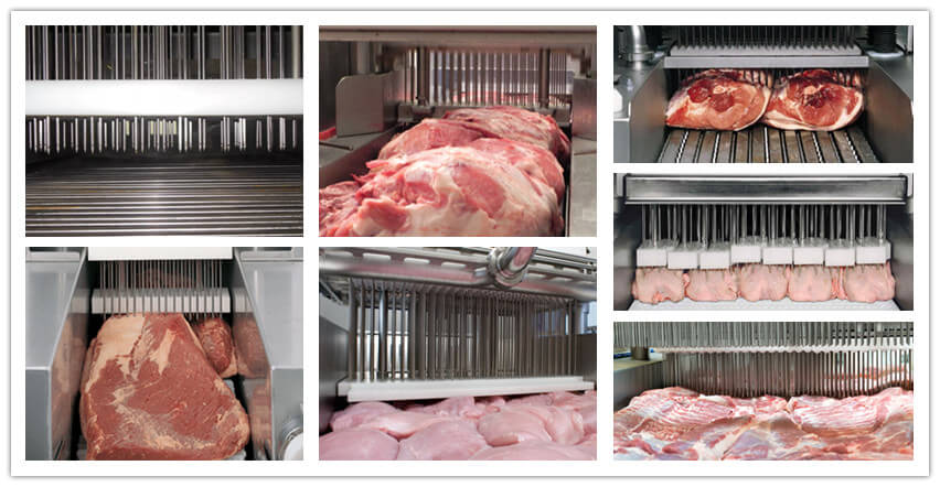 鹽水注射機是利用機械裝置將腌制劑通過注射針注射入產品,使之在產品內均勻分布達到快速腌制、增加調味、保持肉食營養、強化口感的目的。