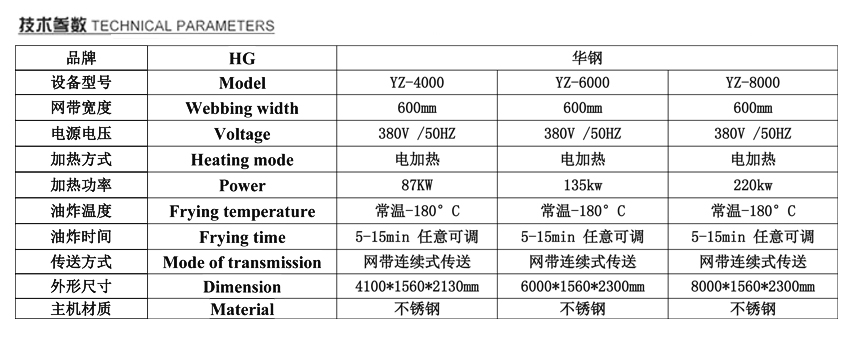 全自動油炸機加熱方式分為:電加熱、導熱油加熱、燃氣加熱。       全自動油炸機設計分為純油自動刮渣設計和油水分離設計     (具體可根據客戶產品定制)     1、全程油溫自動控制,溫度從0----230度可隨意設定,適合炸制各種工藝要求的食品。     2、油炸流水線是動態循環過濾系統,特點為網帶為不銹鋼材質,采用變頻無級調速,油炸時間可調。     3、設有自動提升系統、上罩體和網帶可升降,便于人工清洗。     4、設有自動排渣系統、將產生的殘渣隨時排出。     5、采用上、下雙層網帶傳輸,產品被夾在雙層網帶之間,避免產品漂浮。     6、整機采用304不銹鋼制作而成。     7、有獨立配電箱,操作簡單安全.