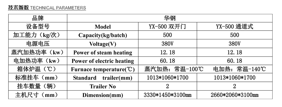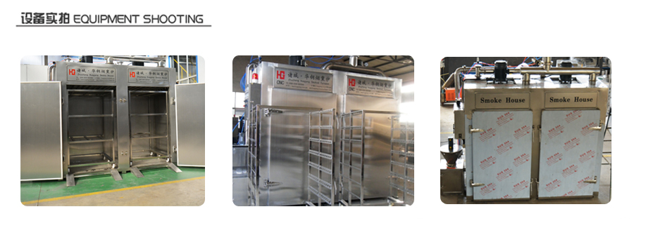 華鋼煙熏爐主要是由爐體、控制箱、發煙室三部分組成。爐體是進行煙熏上色蒸煮烘干的場所,上部有風扇、銅盤管,風扇的作用是在電機的帶動將吸上來的熱氣、煙霧進行擴散,達到均勻地效果。銅盤管是用于烘干功能時,蒸汽通過蒸汽預留口進入銅盤管內,銅導熱性好,傳熱速度快,并且增大了接觸空間,升溫速度更快。電加熱管在兩側,升溫速度快,受熱均勻。兩個溫度探頭,一個測爐內溫度一個測食品溫度,外觀的幫助我們判斷產品的熟化狀態。爐內兩側有獨立煙道,上部設有排氣口、排煙口,側面專門有蒸汽對流口,目的也是保證爐內溫度、煙霧上下一致的效果,避免上下溫度不一致,煙熏色澤不一致的狀況。在爐內的底部設有排水口,排除蒸汽遇冷凝結形成的水珠。